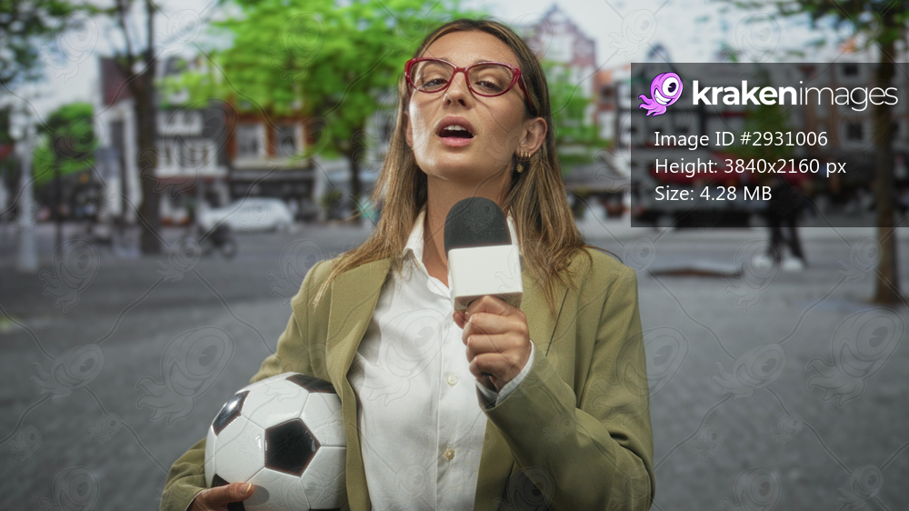 Woman reporter holds microphone and soccer ball while speaking on busy street; confidence sports reporting.