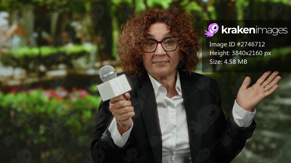 Woman reporter in park holding microphone with curly hair mid-sentence wearing glasses outdoors surrounded by greenery casually looking in focus ready brunette hispanic middle-aged