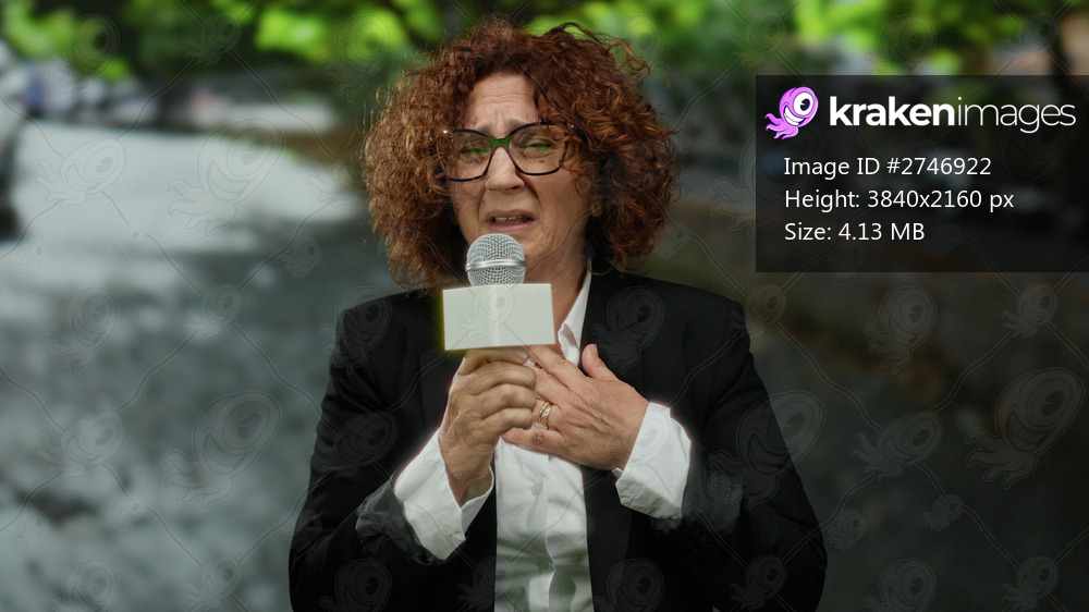 Woman reporter with microphone on city street shows emotion during outdoor interview.