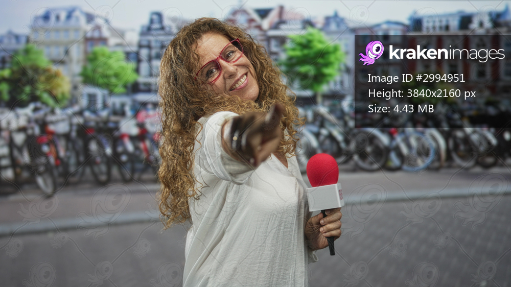 Woman reporter points finger to camera holding red microphone on a street with parked bicycles and historic buildings; confidence connection.