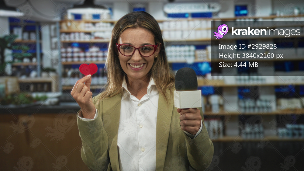 Woman reporter smiling holds microphone and small red heart in pharmacy; compassion health outreach.