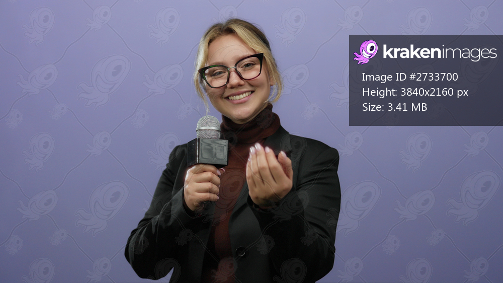 Woman reporter smiling with microphone and gesturing come here on purple isolated background wearing glasses and suit suggesting engagement and communication. - Kraken Images