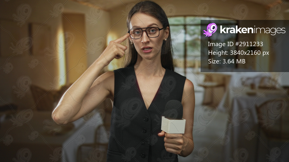 Woman reporter wearing glasses and black vest holding microphone points finger to head in building; thinking confusion.