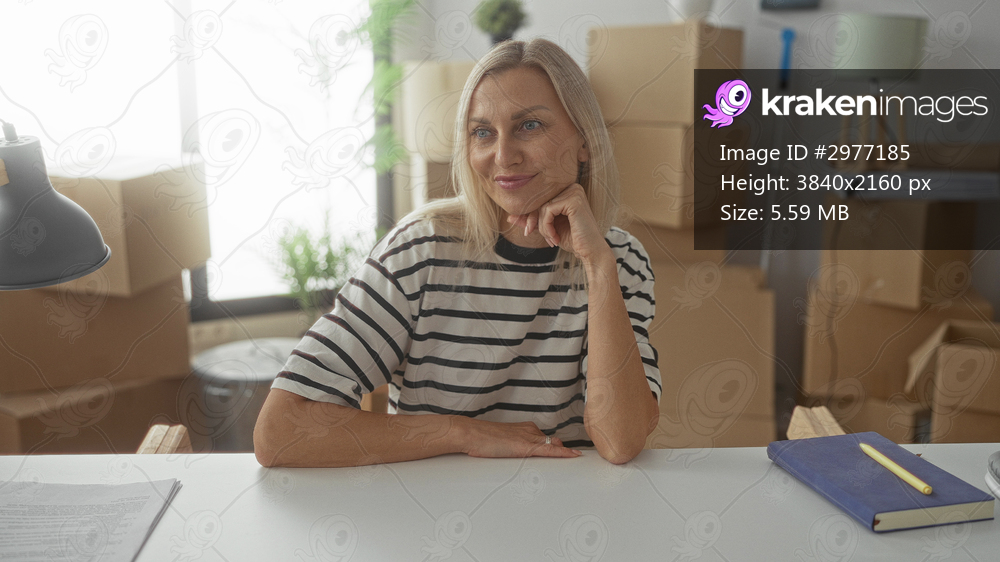 Woman resting chin on hand at table with notebook and cardboard moving boxes in studio; calm new beginning.