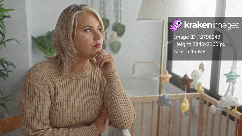 Woman resting chin on hand by wooden crib under floor lamp in sunlit bedroom with star mobile; concern reflection introspection doubt.