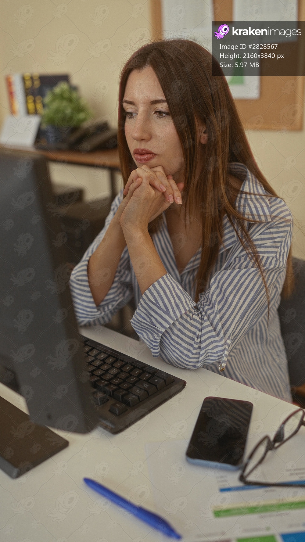 Woman resting chin on intertwined hands while looking at computer monitor at building desk; contemplation.