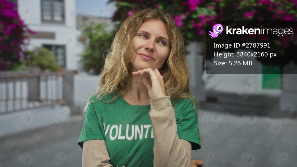 Woman resting chin and thinking outdoor beside blonde young volunteer wearing tshirt with smile and casual posture.