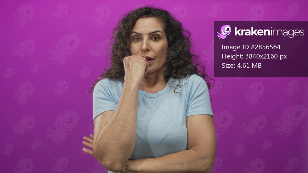 Woman resting hand on chin against vibrant purple studio wall while looking downward pensively; concern.
