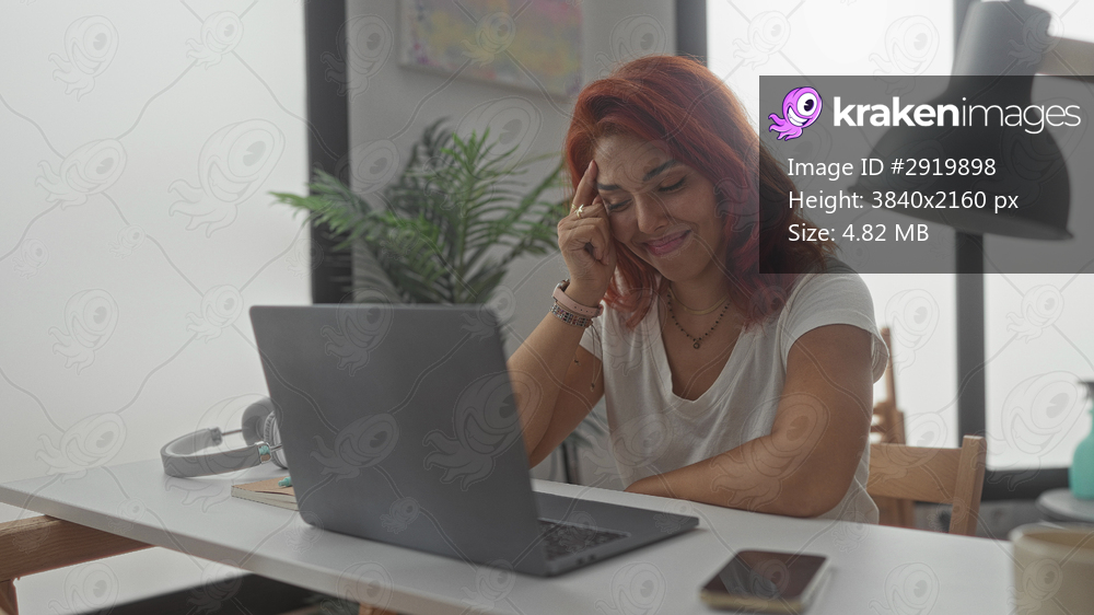 Woman resting hand on chin at laptop on white desk in building near lamp and plant, smartphone and mug visible; quiet contemplation focus.