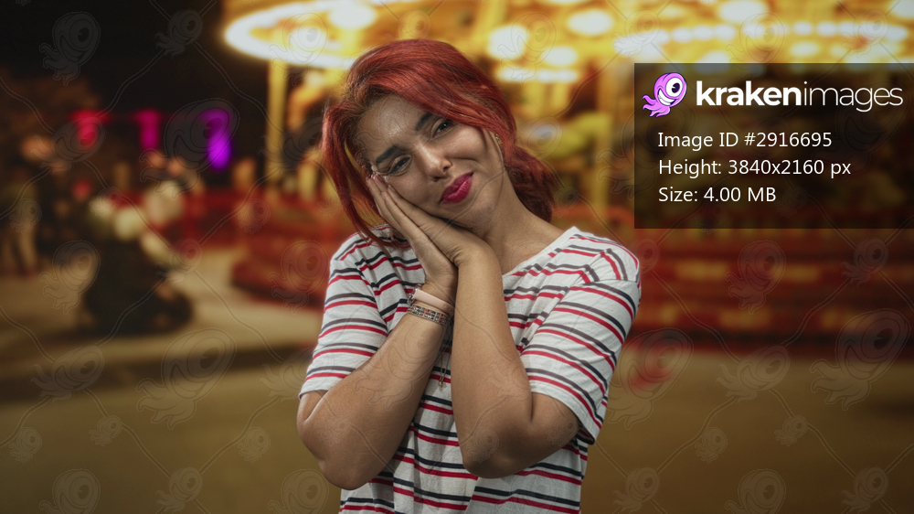 Woman resting hands to cheek beside illuminated carousel on street at night, eyes closed with slight smile and striped shirt visible; contentment.