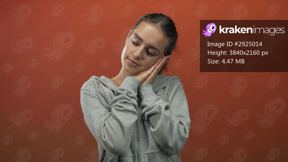 Woman resting head on hands with closed eyes in gray hoodie against orange studio wall and relaxed posture, palms together under cheek; calm.