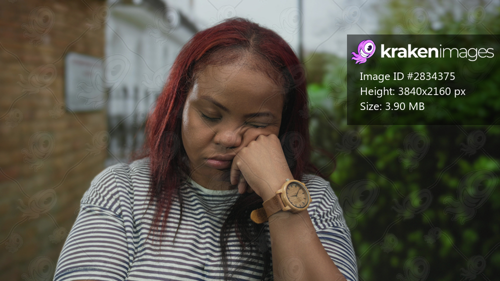 Woman rests cheek on hand wearing wooden watch in front of brick building beside hedge under daylight; weariness.