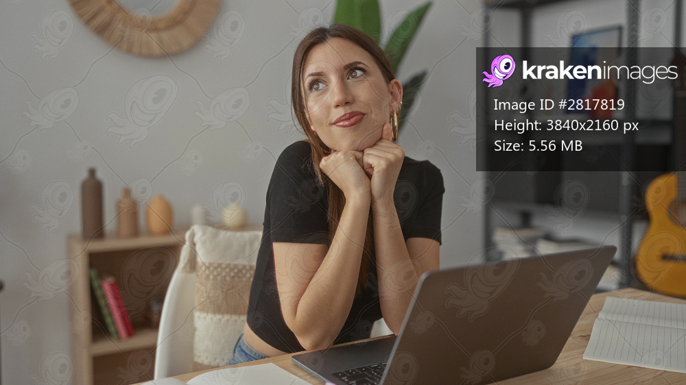 Woman rests chin on fists while gazing over a laptop on a wooden desk in a building; peaceful reflection.