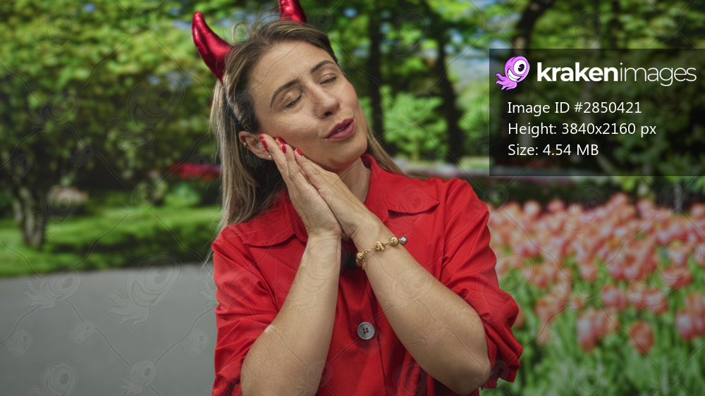 Woman rests hand on cheek with eyes closed among tulip beds in green park under sunlight; calm reflection.