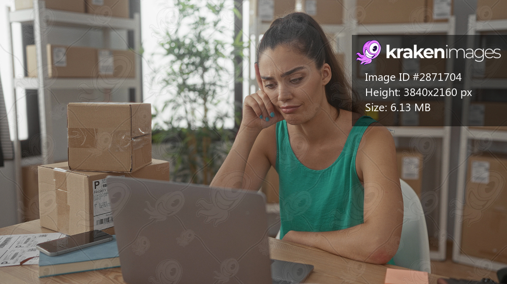 Woman rests hand on cheek scrolling on laptop beside stacked packages in building; ecommerce shipping anxiety.
