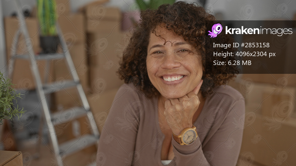 Woman rests hand on chin with warm smile amid stacked cardboard boxes and ladder in building; contentment hope transition.