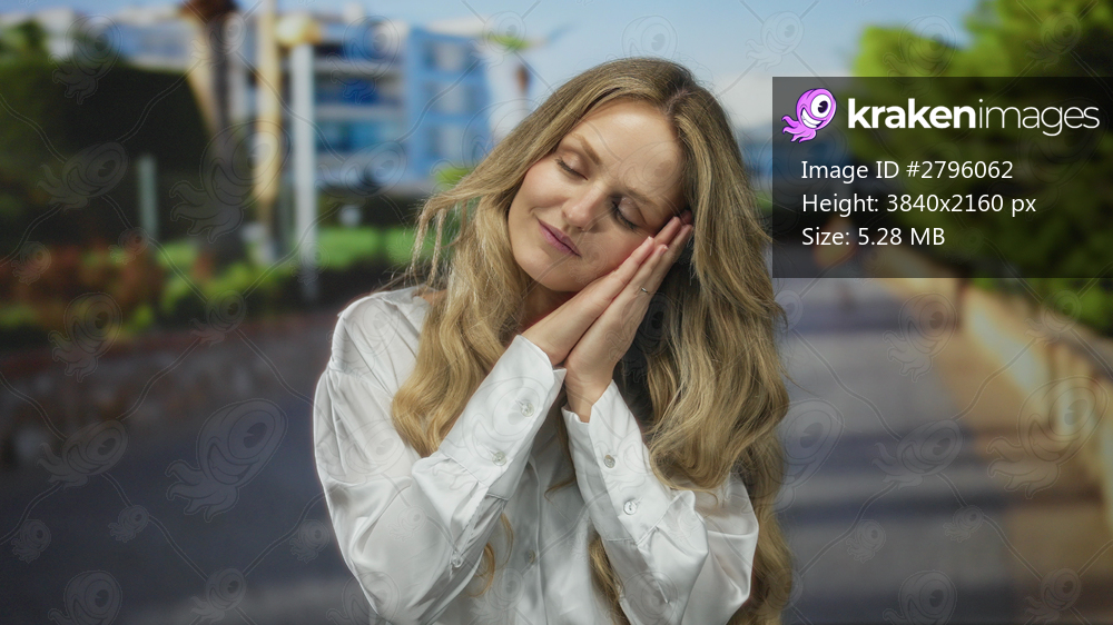 Woman rests hands against her cheek in a sleeping street outdoors daytime scene showcasing a young blonde gesture looking relaxed.