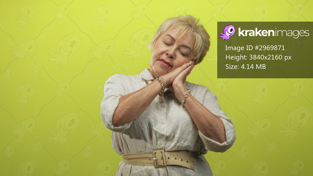 Woman rests head on clasped hands and closes eyes in a studio with lime green wall; calm reflection.