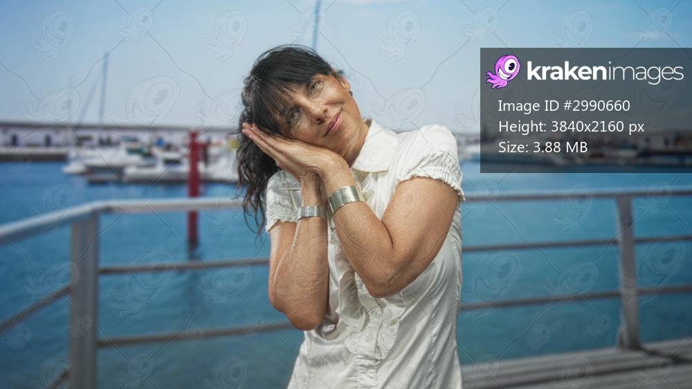 Woman rests head on hands in a sleeping gesture, showing silver bracelets and closed eyes on a marina pier with railing and moored yachts; peaceful relaxation. - Kraken Images