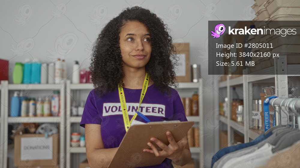 Woman reviewing clipboard in charity center, surrounded by donations, wearing a volunteer shirt, focused on task, representing community service indoors. - Kraken Images