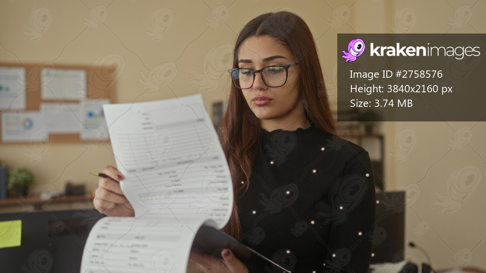 Woman reviewing documents indoors at an office desk in a professional workplace setting, surrounded by books and plants, emphasizing a busy and focused work environment. - Kraken Images
