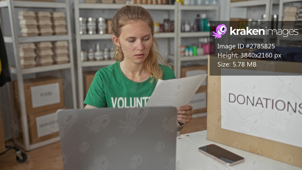 Woman reviews paper while reading warehouse inventory alongside a blonde young volunteer using a laptop next to a box center station.