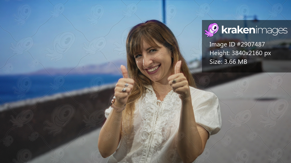 Woman with right hand making ok sign over eye on seaside street promenade, wearing white blouse and smiling at camera; playful confidence.