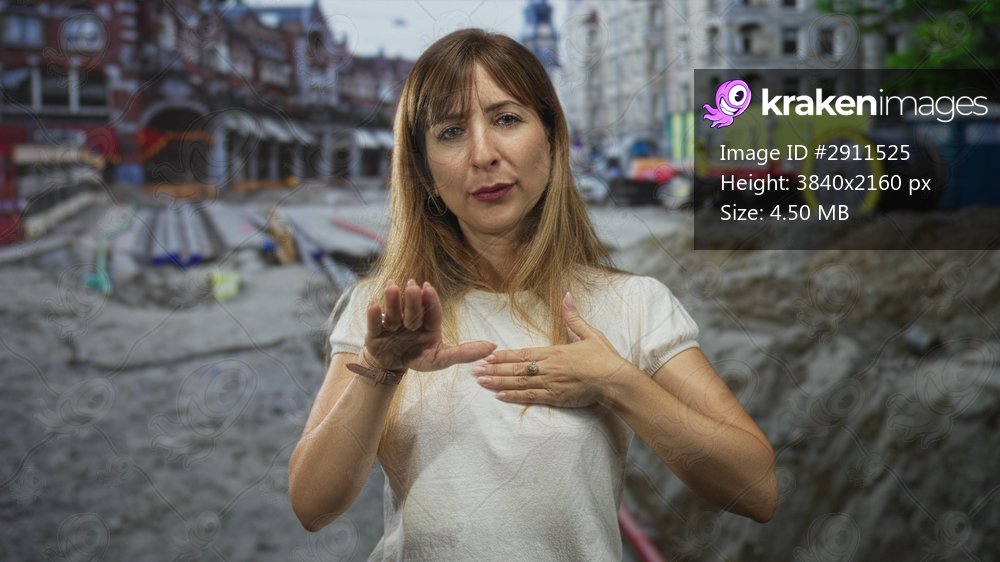 Woman with right hand on chest and left palm out gesture in street amid construction; calm reassurance.