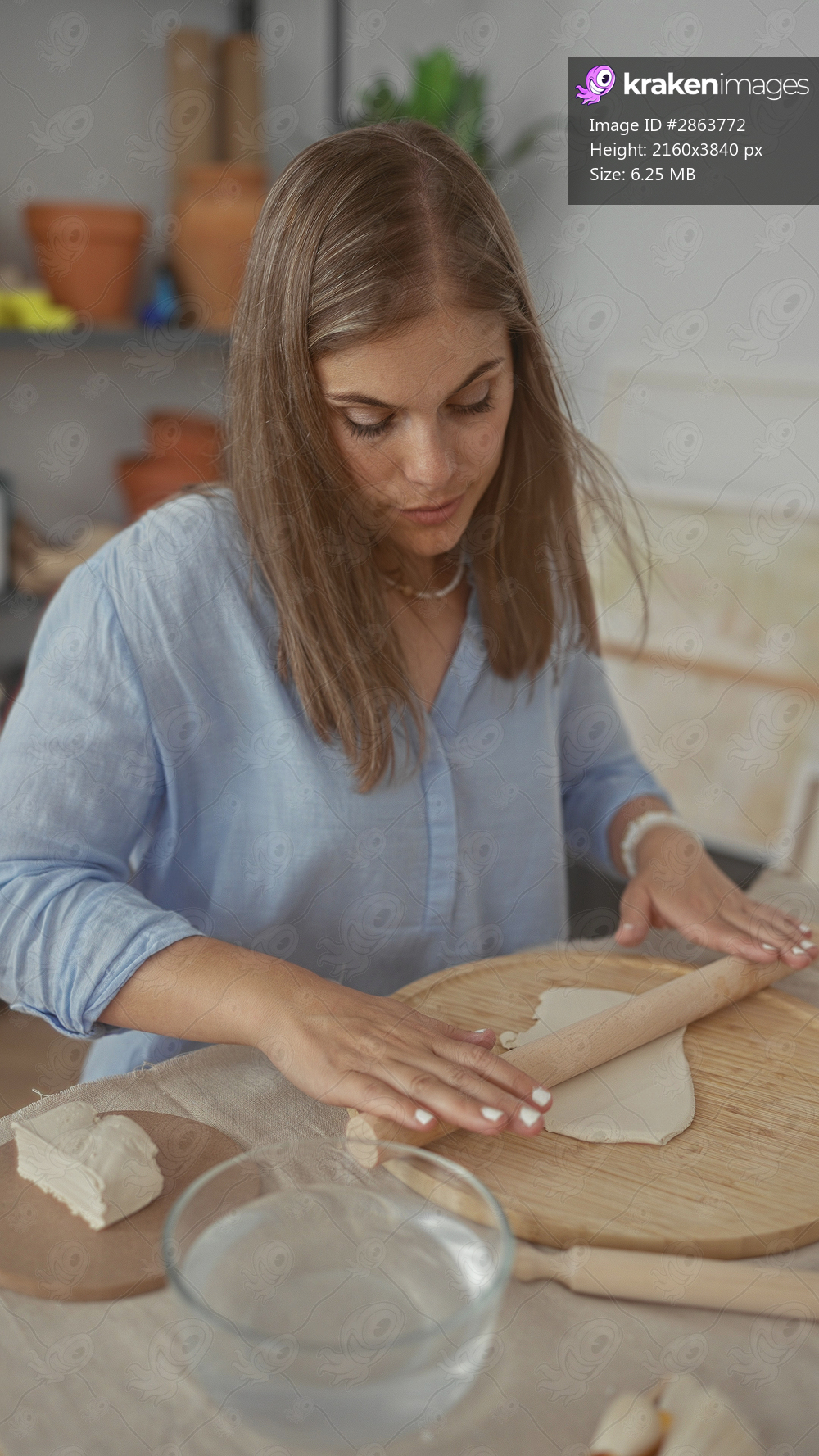 Woman rolling clay into a thin slab with a wooden rolling pin on a round board in studio; calm creativity.