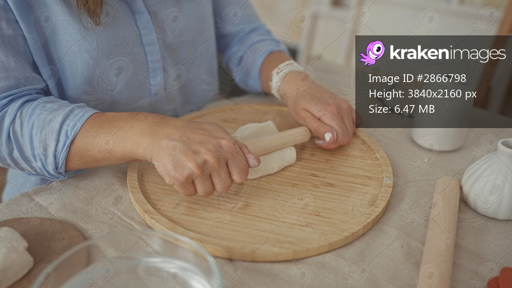 Woman rolls clay with hands and rolling pin on wooden board in bright studio; creative flow serenity.