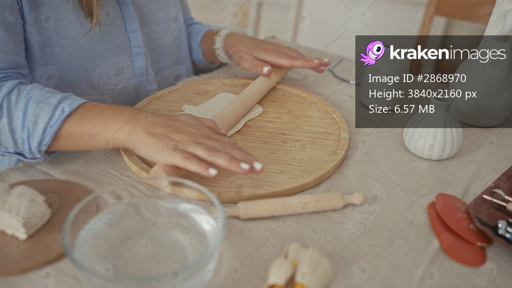 Woman rolls clay slab on a round wooden board with rolling pin in studio with natural daylight; creative concentration.
