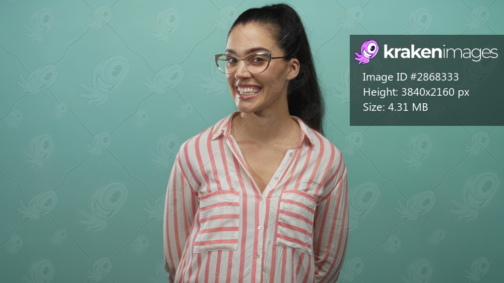 Woman rolls eyes in studio setting wearing glasses and a pink striped shirt with hands behind her back; skepticism.