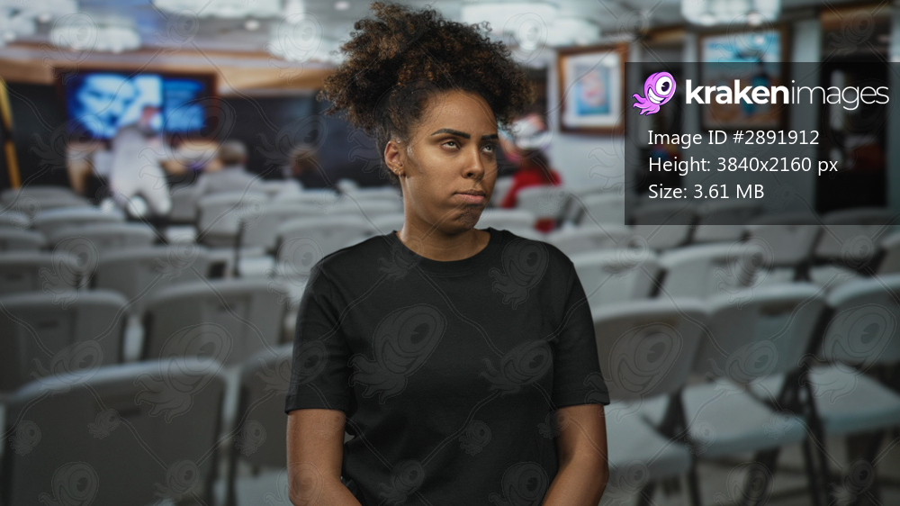 Woman rolls eyes while seated among rows of folding chairs and framed artworks in an art gallery building, wearing a black tshirt and looking upward; annoyance. - Kraken Images