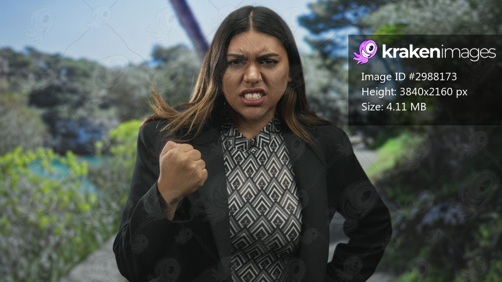 Woman rubbing eye and clenching fist on forest path, blazer and geometric top visible, hair flick and scoffing gesture; frustration defiance.