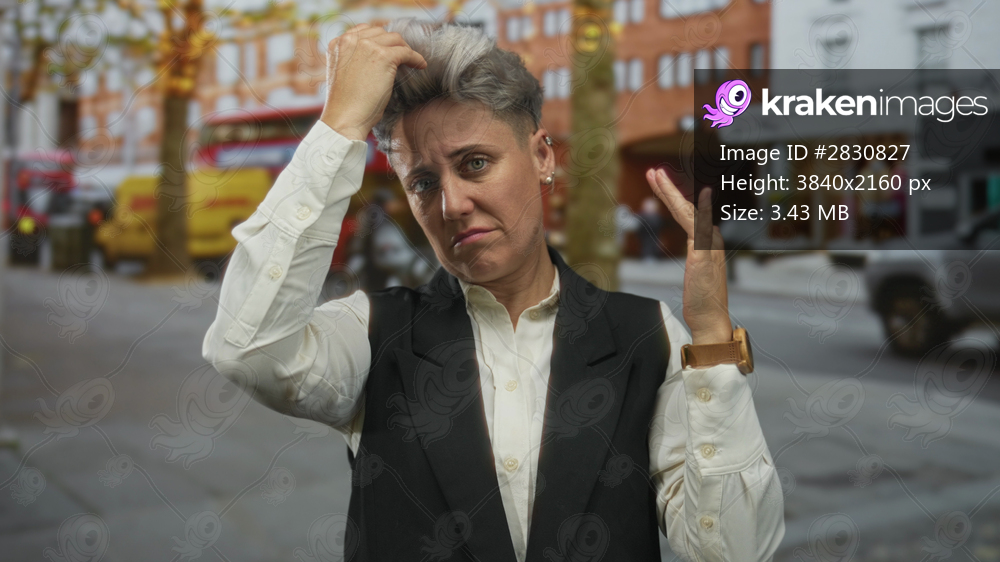 Woman rubbing eyes and pressing forehead in discomfort on a city street while wearing white blouse and black vest; fatigue.