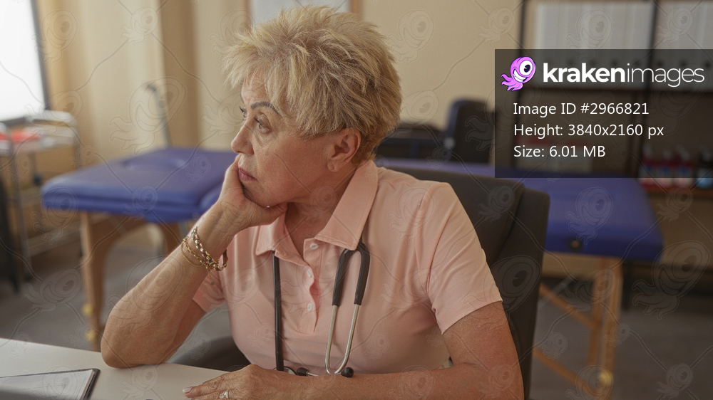 Woman rubbing face with hands, stethoscope on neck, seated at desk with laptop and treatment table in a rehabilitation clinic; fatigue concern.