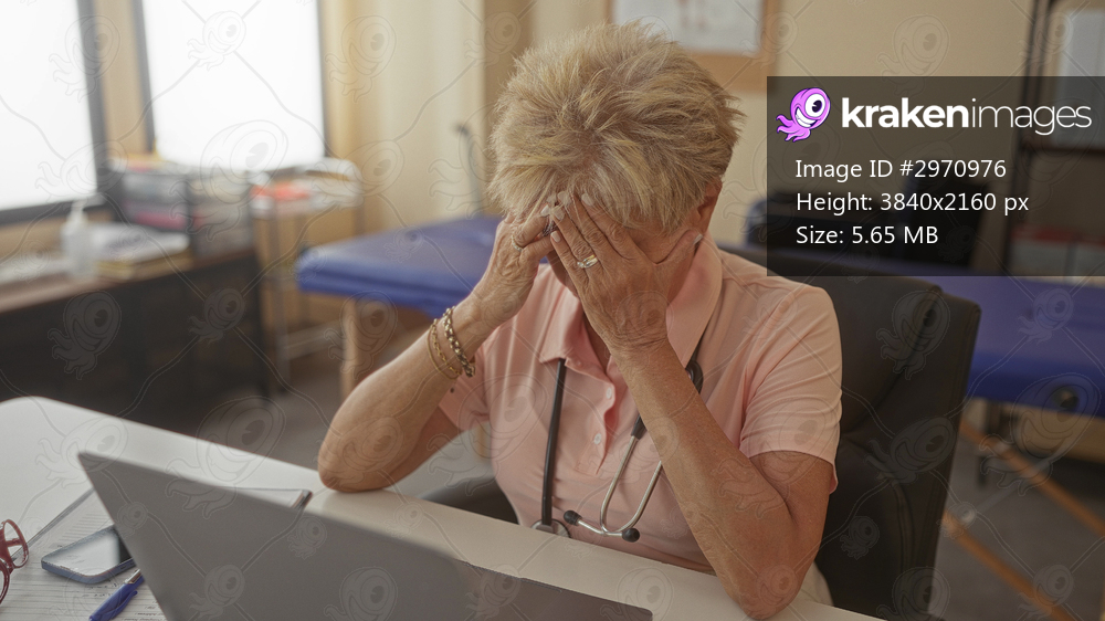 Woman rubbing face with hands, stethoscope on neck, seated at desk with laptop and treatment table in a rehabilitation clinic; fatigue concern.