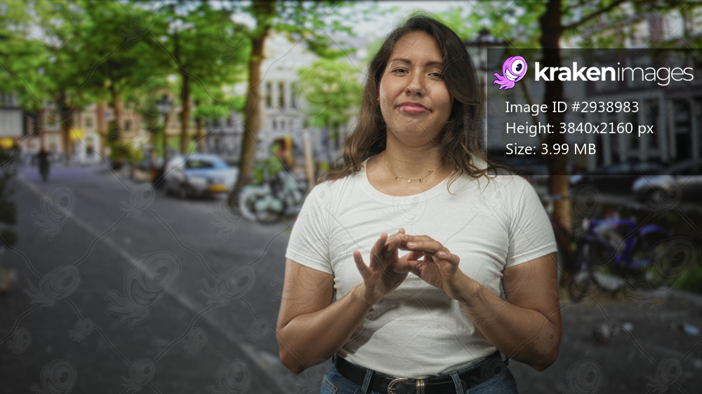 Woman rubbing hands on a city street with white t shirt and necklace visible, buildings and bikes behind her; awkwardness.
