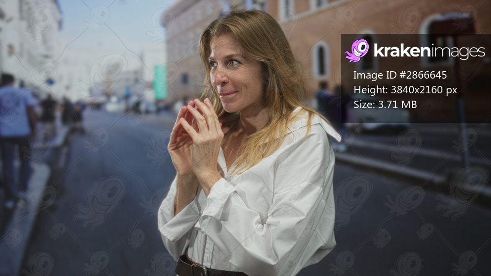 Woman rubbing hands together on a street in the city wearing white shirt; anticipation curiosity discovery.