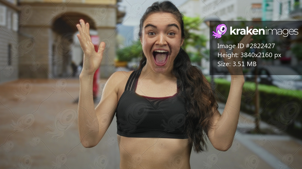 Woman rubbing her eyes with fists revealing bare abdomen in a busy urban street setting; astonishment.