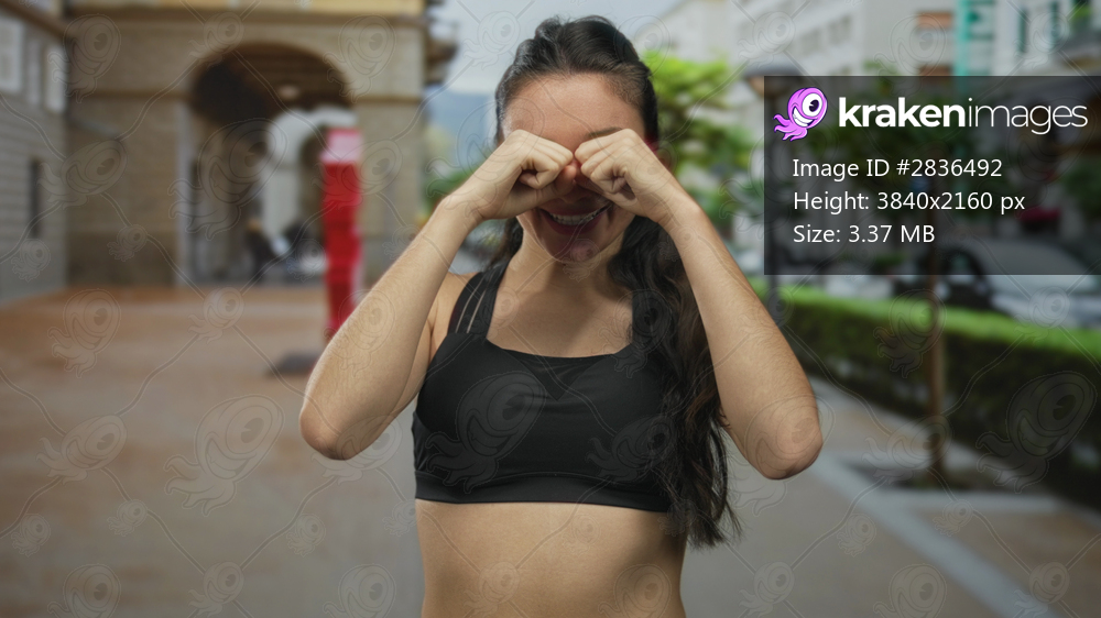 Woman rubbing her eyes with fists revealing bare abdomen in a busy urban street setting; astonishment.
