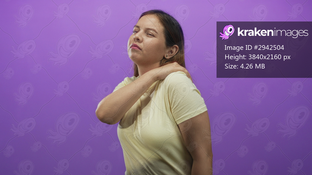 Woman rubbing her shoulder with hand, eyes closed, wearing yellow t shirt in purple studio; muscle tension discomfort.