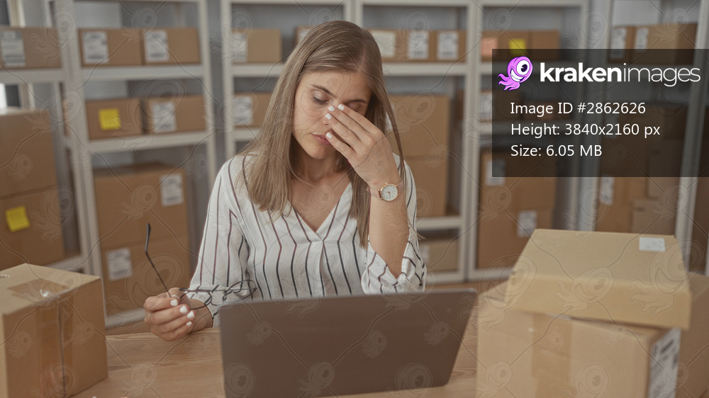 Woman rubbing her tired eyes while holding glasses beside a brown parcel box inside a building; fatigue.