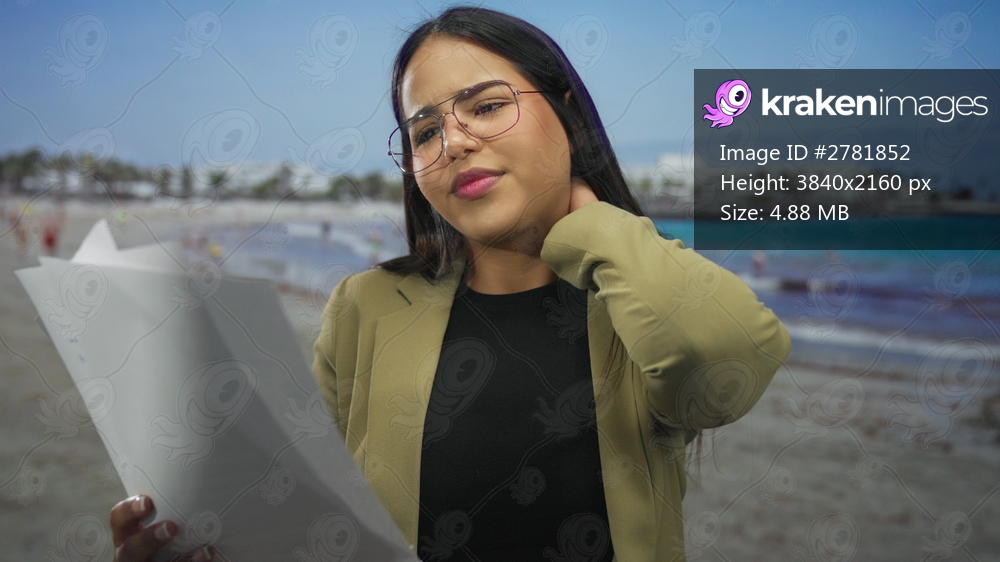 Woman rubbing neck looks stressed on a beach with a young latin hispanic presence by a seaside outdoors holding a paper.