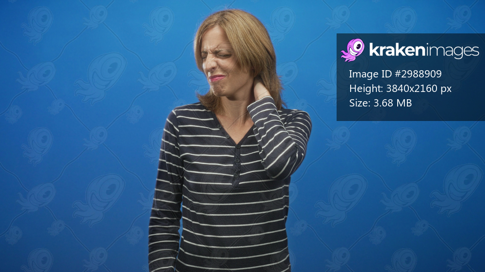 Woman rubbing neck with right hand, wincing and holding her bare neck, striped top against blue backdrop in studio; discomfort recovery.