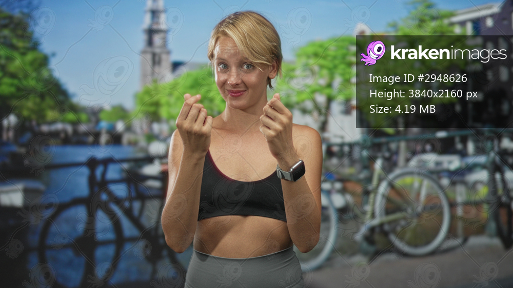 Woman rubbing palms and smiling with smartwatch on wrist, blond sportswear and bicycle by canal visible on street; playful joy.