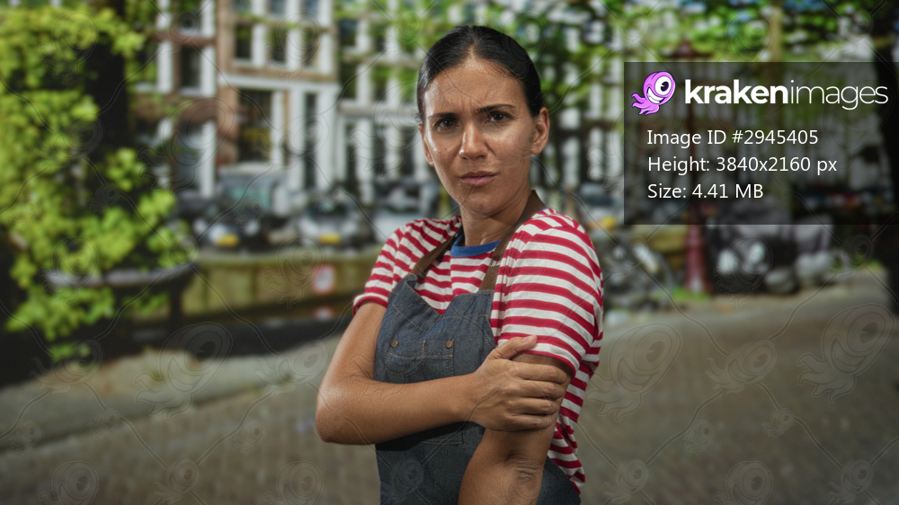 Woman rubbing upper arm and wincing on a street while wearing a striped shirt and denim apron; work fatigue discomfort.