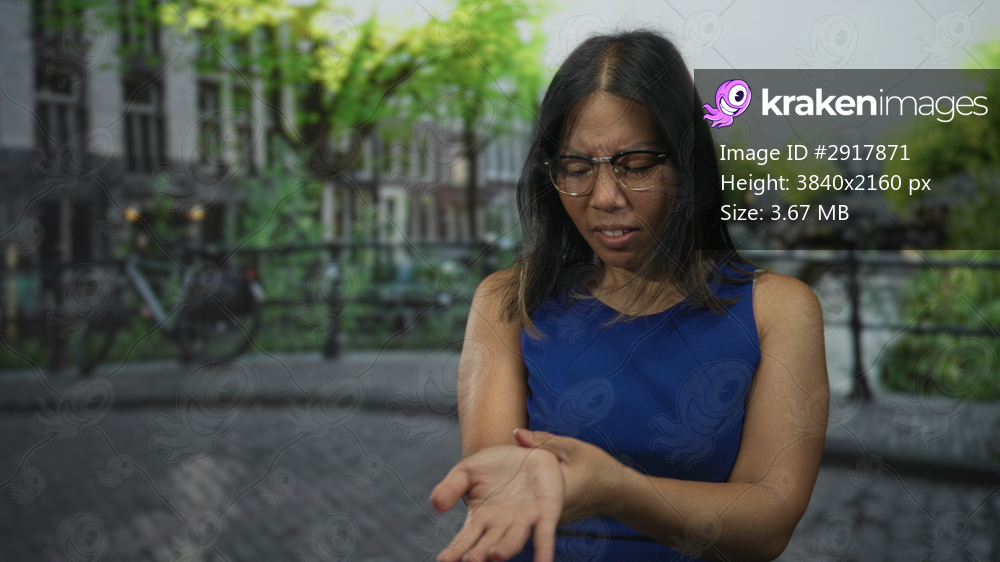 Woman rubbing wrist on a cobbled street in amsterdam canal area near bridge and bicycle; discomfort and concern.