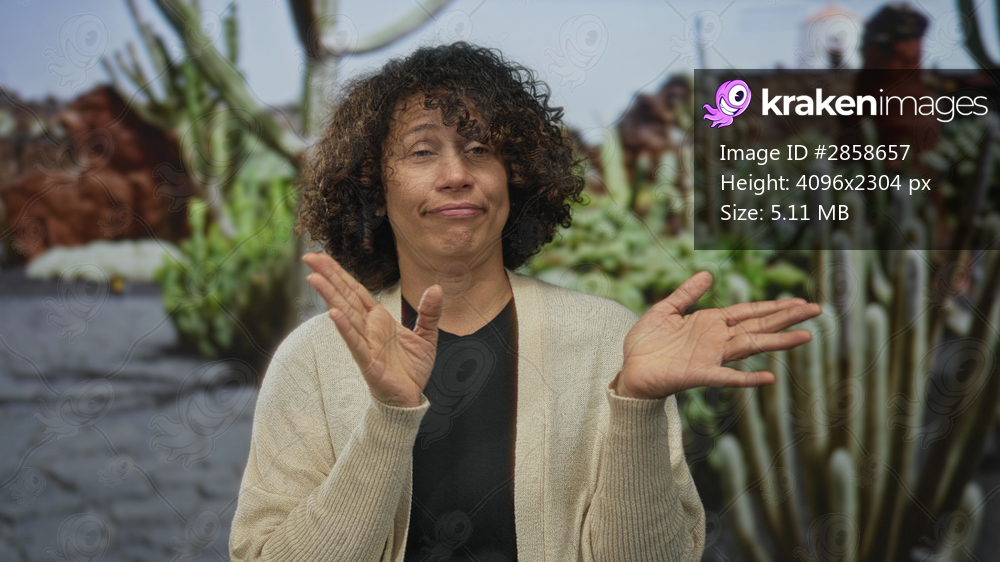 Woman rubs hands before cactus in forest setting under soft daylight among lush green foliage; anticipation.