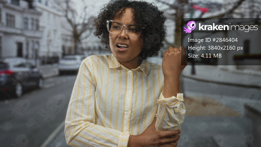 Woman rubs her bare forearm beside parked cars on a quiet city street, examining an irritated patch on her wrist; frustration.